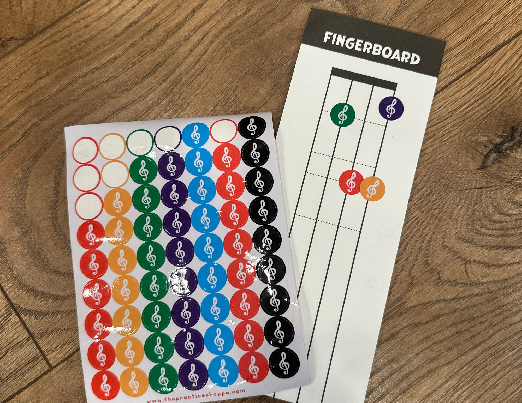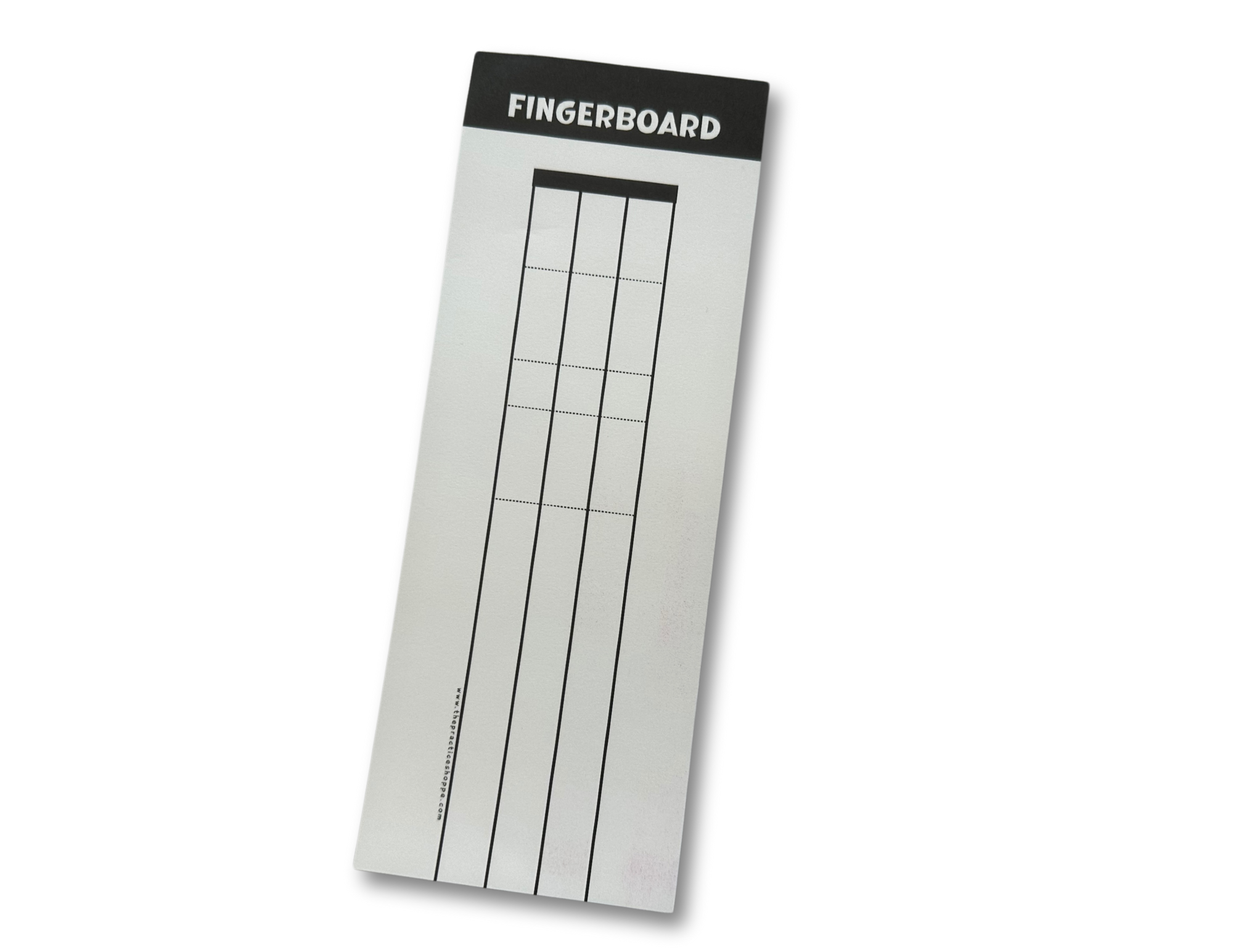 Fingerboard notepads are a great teaching aid that opens up several fun activities for learning and practicing violin (or viola or cello) skills. Use with stickers to identify the different fingerings and notes. Spell words using the notes on the fingerboard. Use the fingerboard pad to practice finger patterns for different pieces or scales. Teach about whole and half steps, naturals, sharps and flats, plus all other intervals. Play a note on the violin and have students find and mark the corresponding finger position on the fingerboard. Create quiz questions related to the fingerboard such as identifying notes or intervals. 8" x 3", 50 pages.