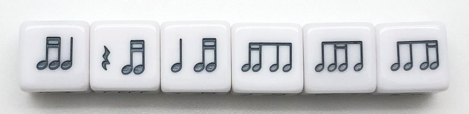 These dice are great for composing because the rhythms are variable, but each side is only one beat. This way you can easily fill measures in any time signature and learn the tricky dotted eighth note rhythms.