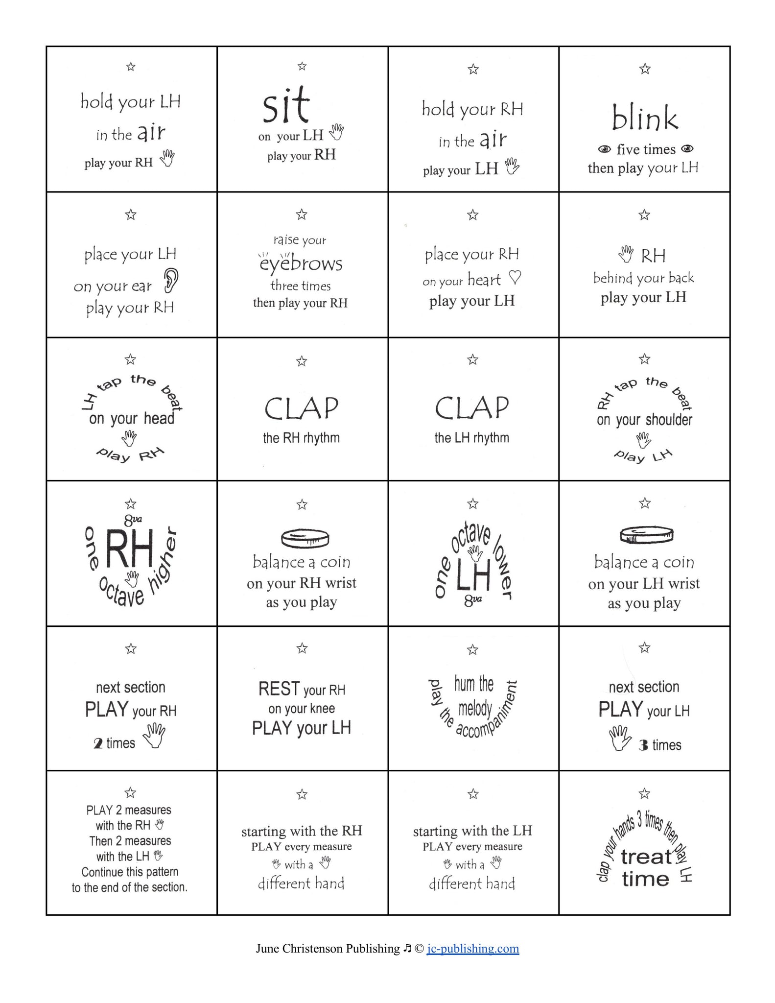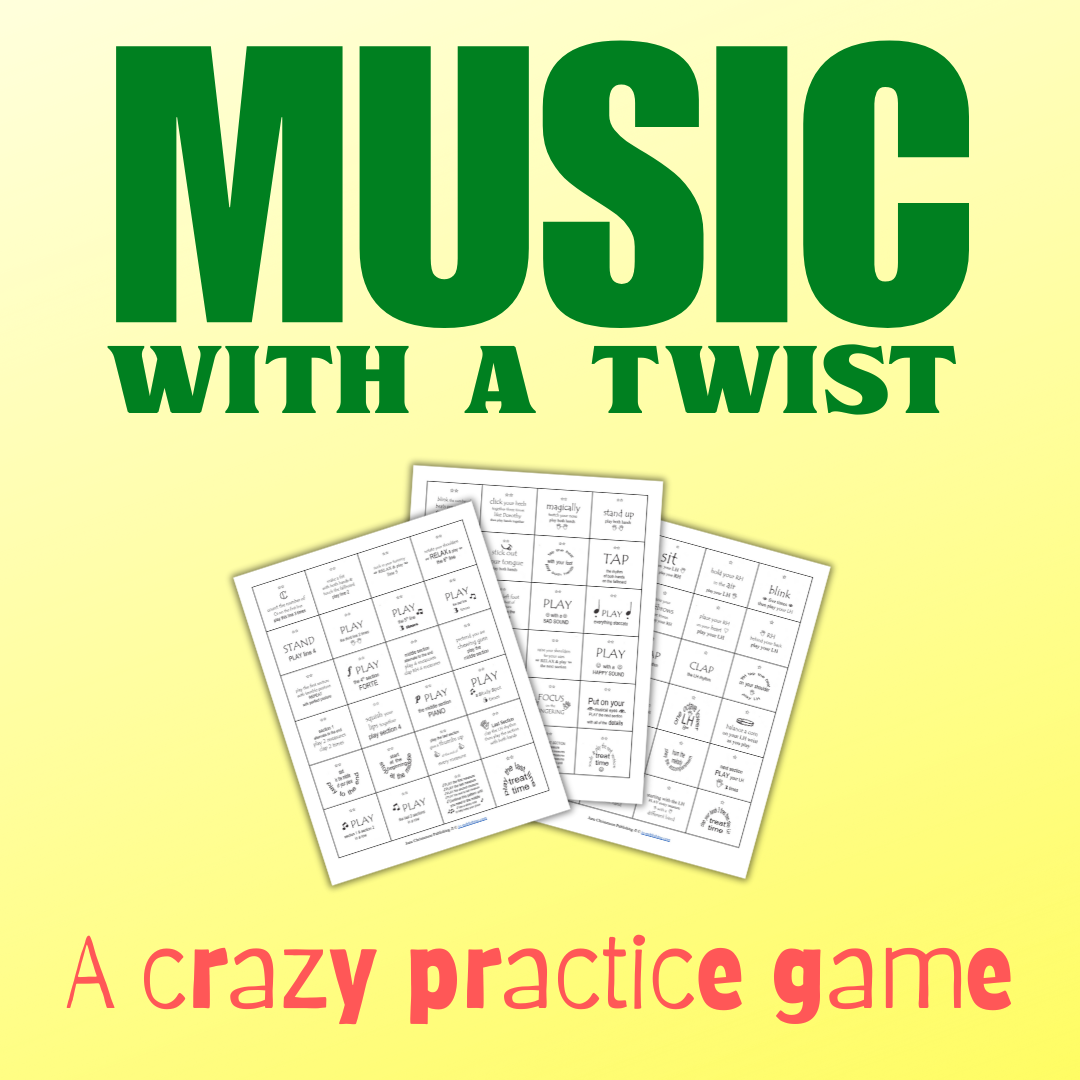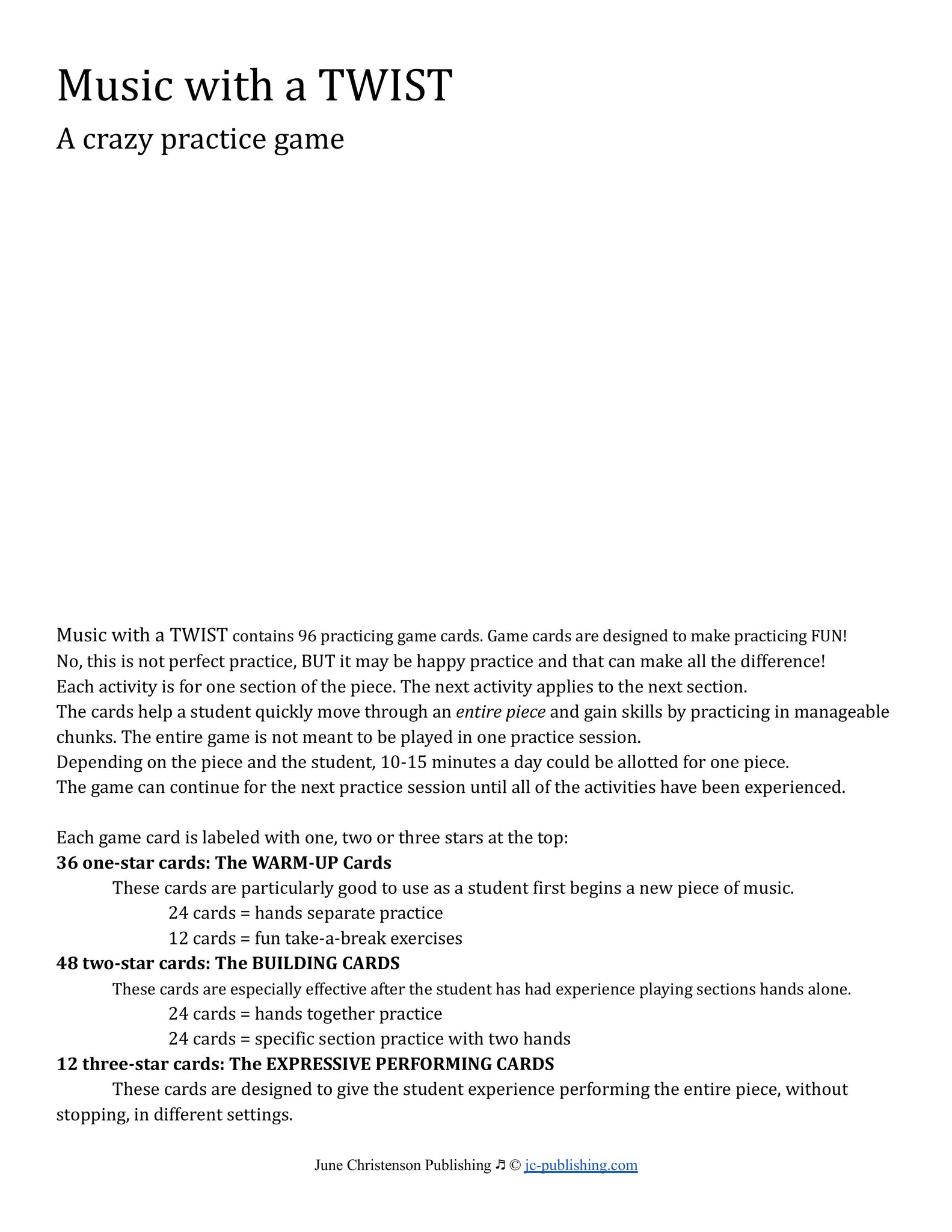 Music with a TWIST contains 96 practicing game cards. Game cards are designed to make practicing FUN! No, this is not perfect practice, BUT it may be happy practice and that can make all the difference! Each activity is for one section of the piece. The next activity applies to the next section. The cards help a student quickly move through an entire piece and gain skills by practicing in manageable chunks. The entire game is not meant to be played in one practice session. Depending on the piece and the student, 10-15 minutes a day could be allotted for one piece. The game can continue for the next practice session until all of the activities have been experienced.