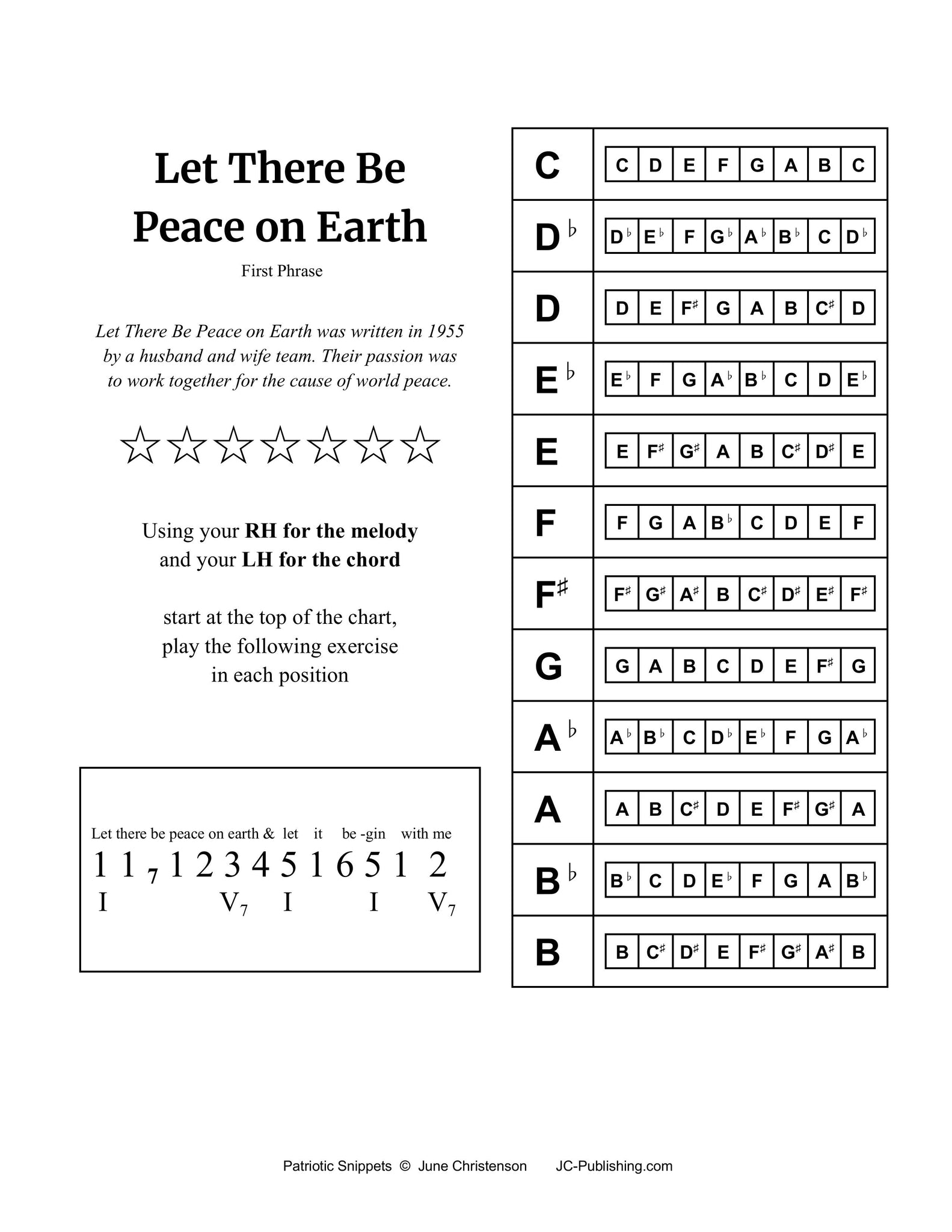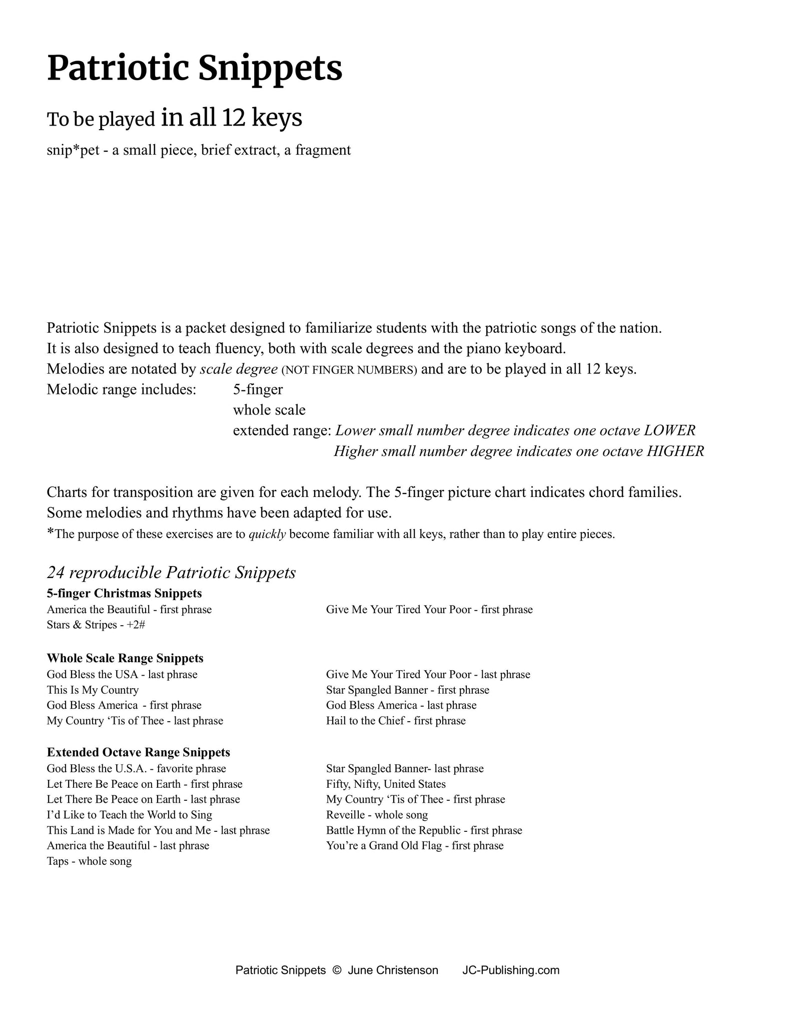 Patriotic Snippets is a packet designed to familiarize students with the patriotic songs of the nation. It is also designed to teach fluency, both with scale degrees and the piano keyboard. Melodies are notated by scale degree (NOT FINGER NUMBERS) and are to be played in all 12 keys.